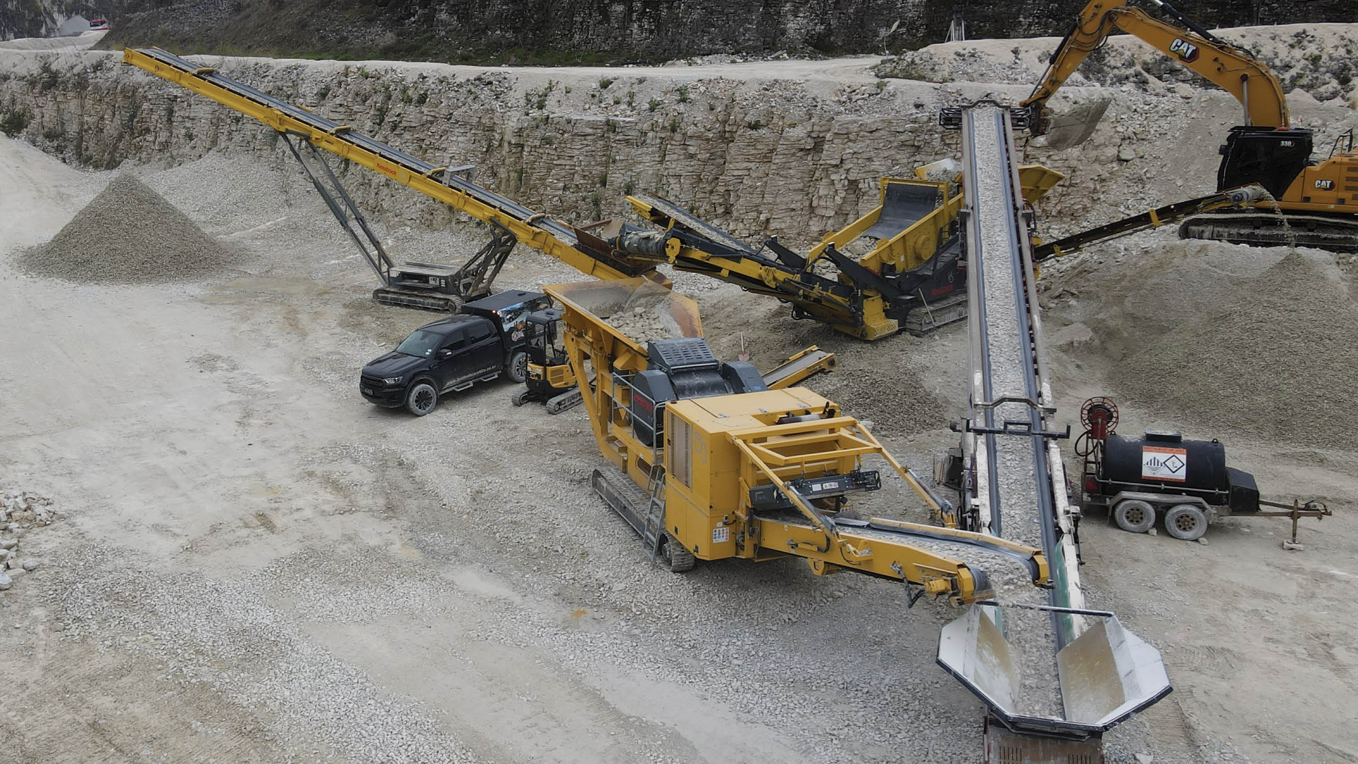 In the limestone quarry of Te Kūiti, AJ Holden stands among the machines — an S5 track stacker, a K5 screening plant, and a B3 jaw crusher all running on site.
